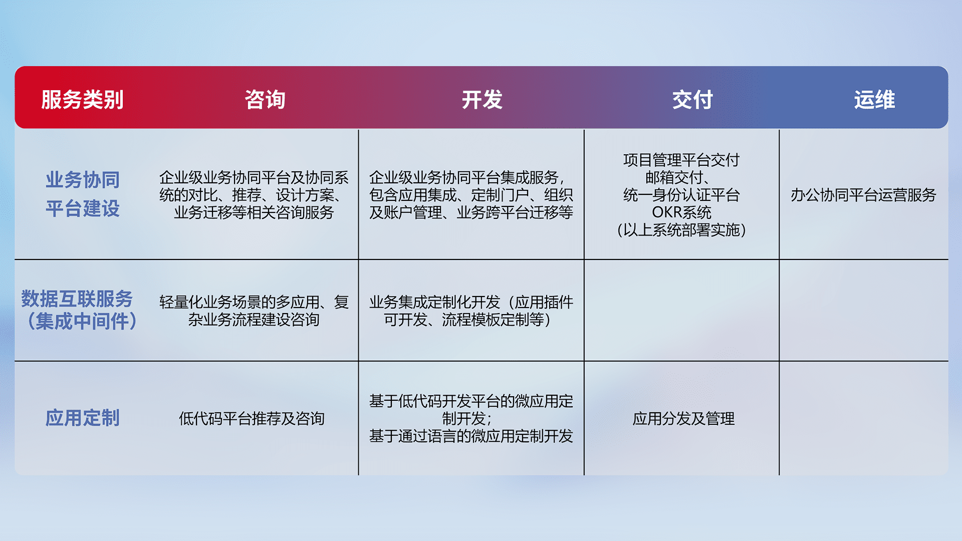 针对钉钉、、、企微、、IDaas等平台级产品提供产品的规划、、、、方案、、、交付、、定制化开发等服务,,,,实现如统一协同办公、、、智能客户服务、、、、混合会议管理、、、、智能数据查询、、、、等业务场景,,,实现数字化转型。。。。