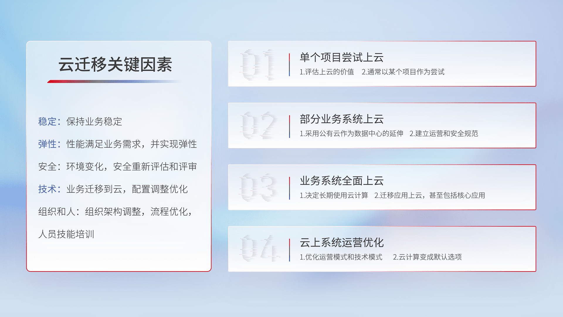 结合实际业务,,,从规划设计、、、、云平台选型、、云原生改造、、数据迁移、、集成交付,,,迁移全过程为客户识别最佳上云路径,,,做好风险识别管理,,设计网络架构、、、、身份权限、、、、安全审计合规、、操作审计、、、日志审计、、、监控告警策略、、、、多站点容灾设计等,,对云上基础设施进行整体规划,,提升IT治理水平,,,以满足弹性、、、高可用、、高性能的需求。。。。