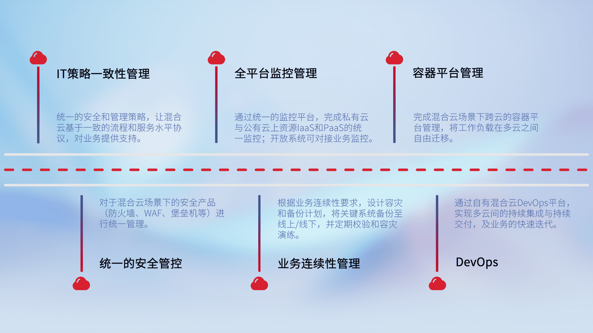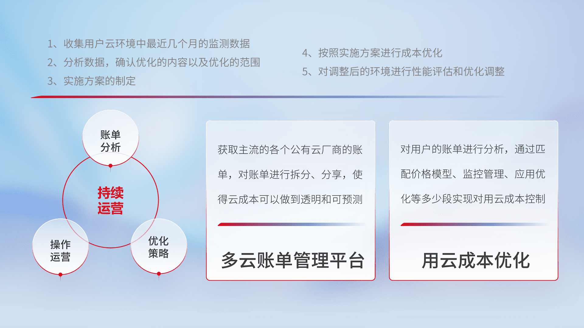 通过多云纳管,,,以统一的资源数据模型把客户的云资源进行抽象和封装,,,进而实现对多云资源的统一操作,,,保障云资源管理的可靠性、、、、稳定性与可用性。。。量身定制化运维内容,,,配置、、、、开发运维、、、、补丁管理、、、备份、、监控、、、认证和访问管理、、审计和日常巡检等,,保障在用云过程中的可靠度,,,稳定度以及高可用率。。。。